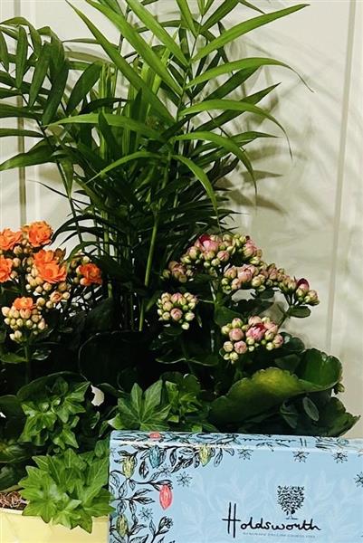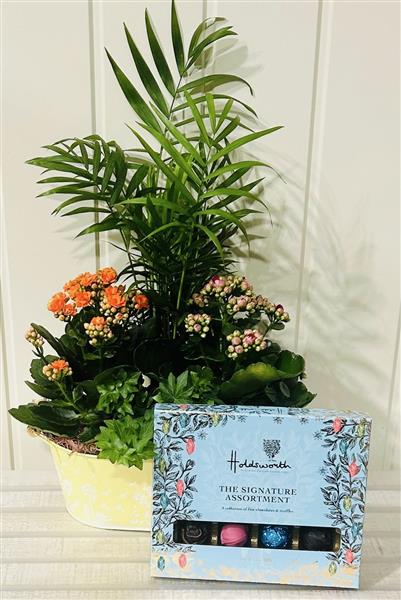 Beautiful bright kalanchoes, palm and ivy in a bright lemon planter with Holdsworth Signature Assortment Chocolate - A collection of fine chocolates and truffles.