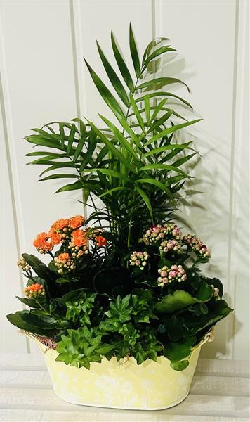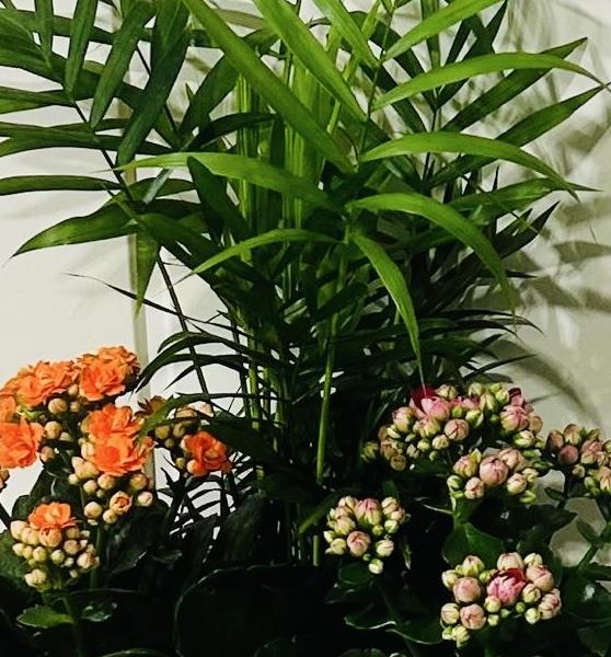 Beautiful bright kalanchoes, palm and ivy in a bright lemon planter. The perfect long lasting gift.