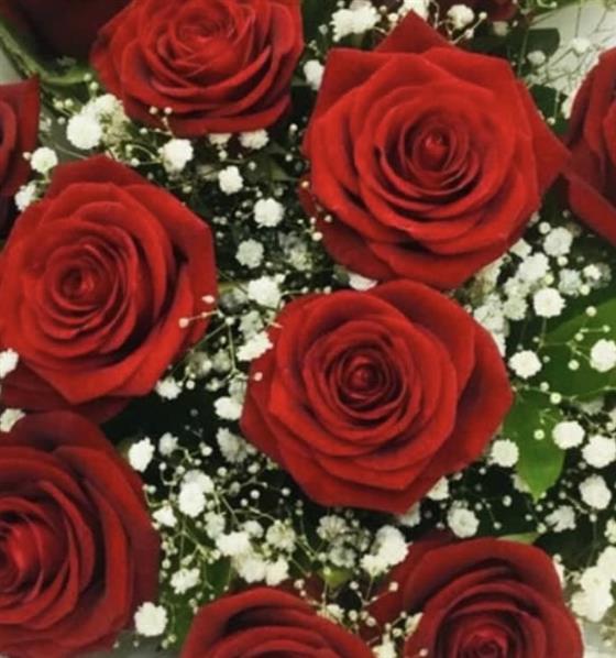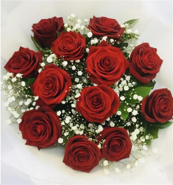 12 Large headed red roses with gypsophelia and foliage.